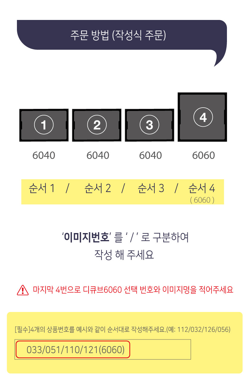 [필수] 4개의 상품번호를 예시와 같이 순서대로 작성해주세요. ( 예: 112 / 032 / 056 / 110(6060) )