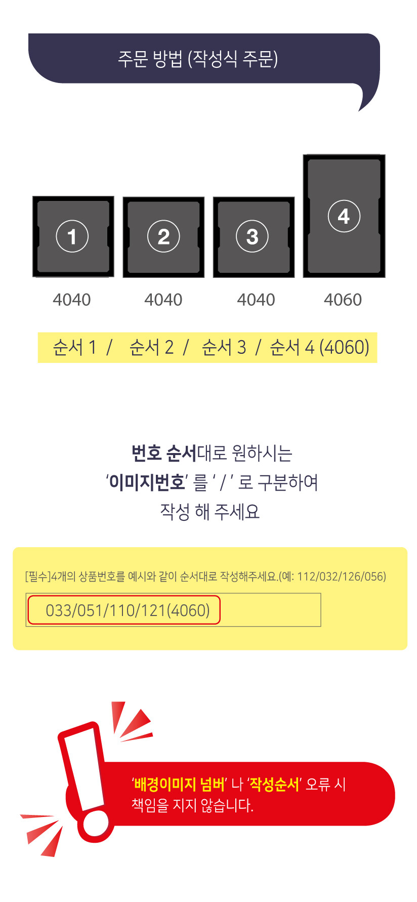 [필수] 4개의 상품번호를 예시와 같이 순서대로 작성해주세요. ( 예: 112 / 032 / 126 / 056(4060) )