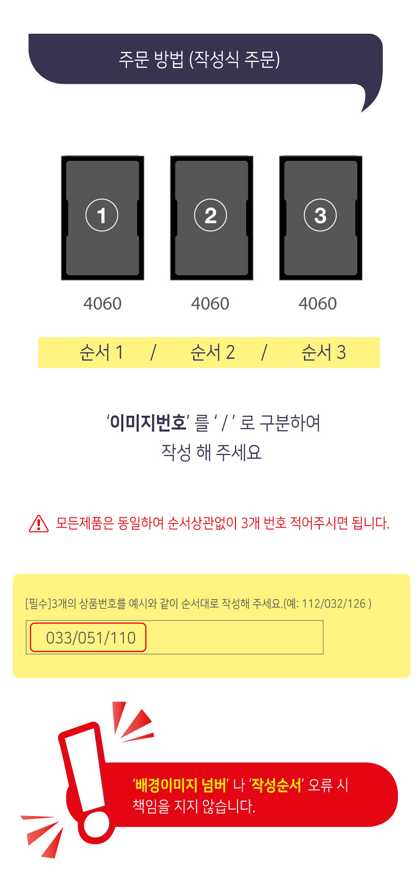 [필수] 3개의 상품번호를 예시와 같이 순서대로 작성해주세요. ( 예: 112 / 032 / 056 )