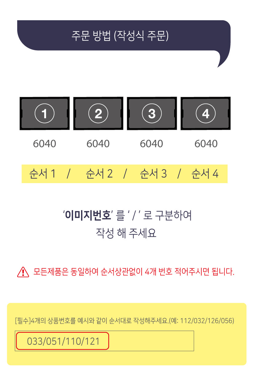 [필수] 4개의 상품번호를 예시와 같이 순서대로 작성해주세요. ( 예: 112 / 032 / 056 / 110 )