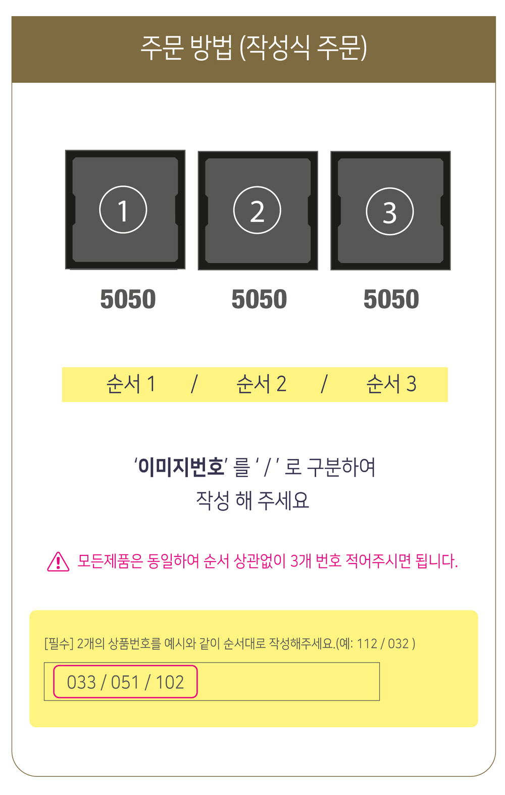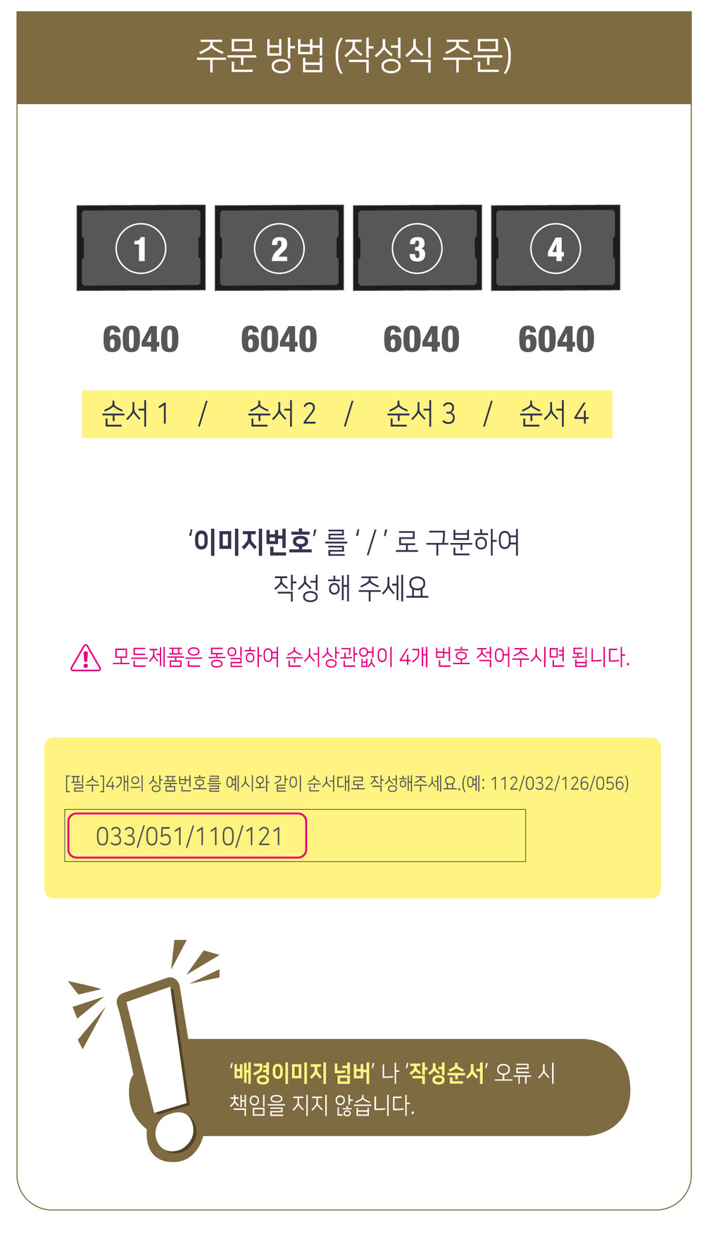 [필수] 4개의 상품번호를 예시와 같이 순서대로 작성해주세요. ( 예: 001 / 012 / 024 / 055 ) )