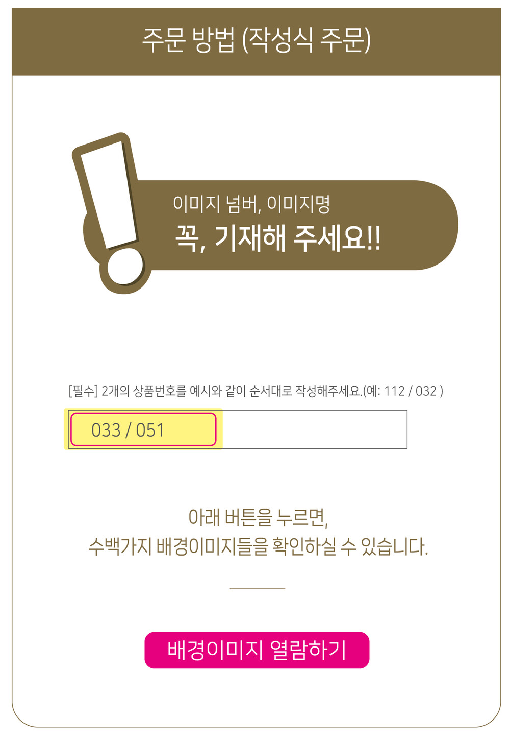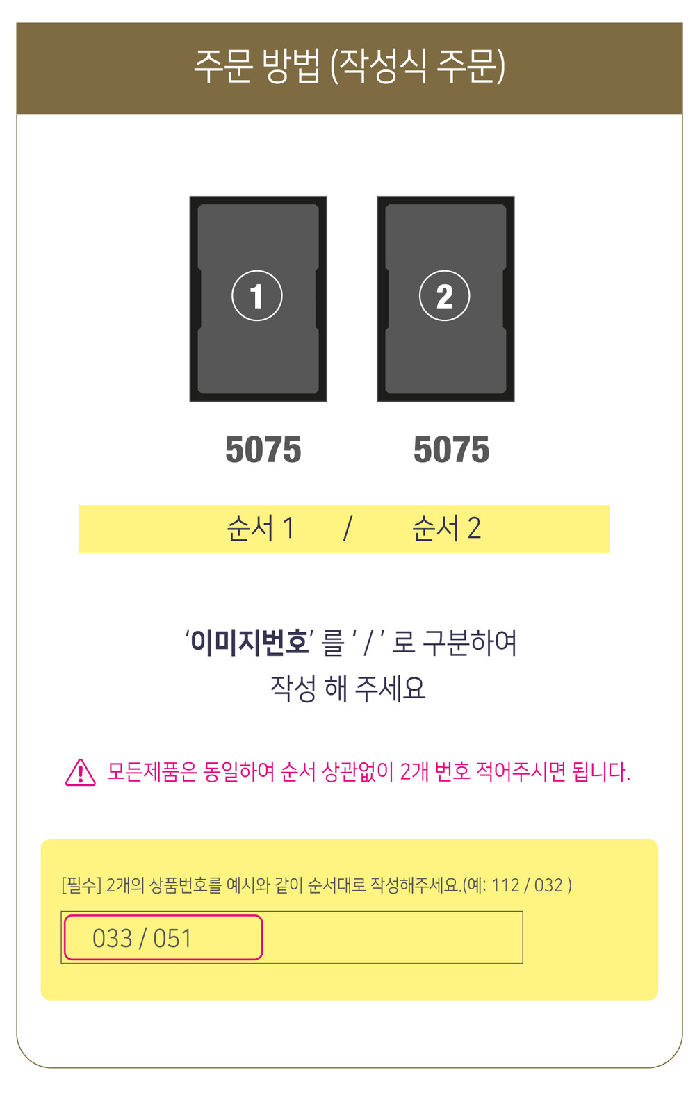 [필수] 2개의 상품번호를 예시와 같이 순서대로 작성해주세요. ( 예: 112 / 032 )